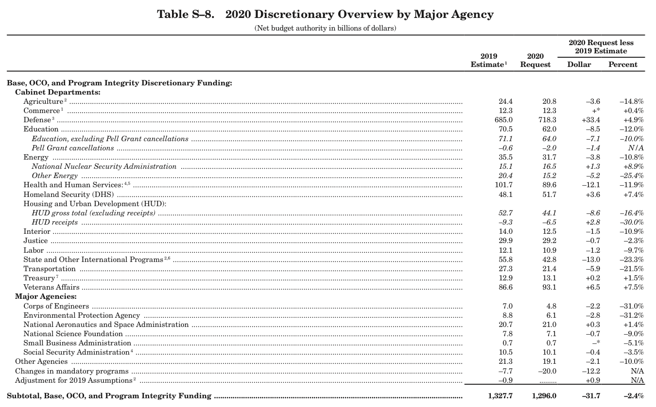 However, these numbers are not entirely accurate, for as OMB explains in Footnote 1 that some of the agencies funding top-lines are based on the FY 2019 continuing resolution levels because the chart was prepared before enactment of the “ Consolidated Appropriations Act 2019” (P.L. 116-6), the bill that ended the five-week partial government shutdown. Nonetheless, they provide a rough if not close sense of how deep some of the proposed cuts would be: