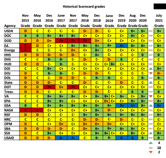 Some of the 2019 recommendations did not make the 2021 list. For example, two years ago the committee called on the Office of Management and Budget (OMB) to ensure that chief information officers (CIO) have the authority to make agency wide decisions on cybersecurity. The FITARA scorecard may explain why this is no longer a pressing issue, for most agencies now have their CIO in a position to directly report to the agency head, meaning the CIO is organizationally positioned to be more effective. This has long been seen as a way to drive better cybersecurity. A similar recommendation was made in 2019 regarding information security and CIOs reporting to agency heads. The FITARA scorecard also shows a number of agencies earning A’s in the category of enhancing agency CIO authority, and thus these two recommendations may not be as pressing as they once were.