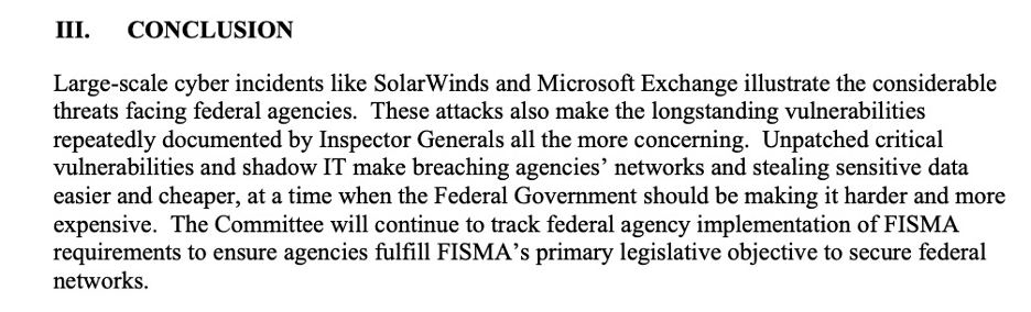 In a sense, there is not much that is new in this report. The committee is relying on OIG FISMA reports that are released annually, and it may be fair to assert the committee is just pulling the information together, which can often be a helpful task.