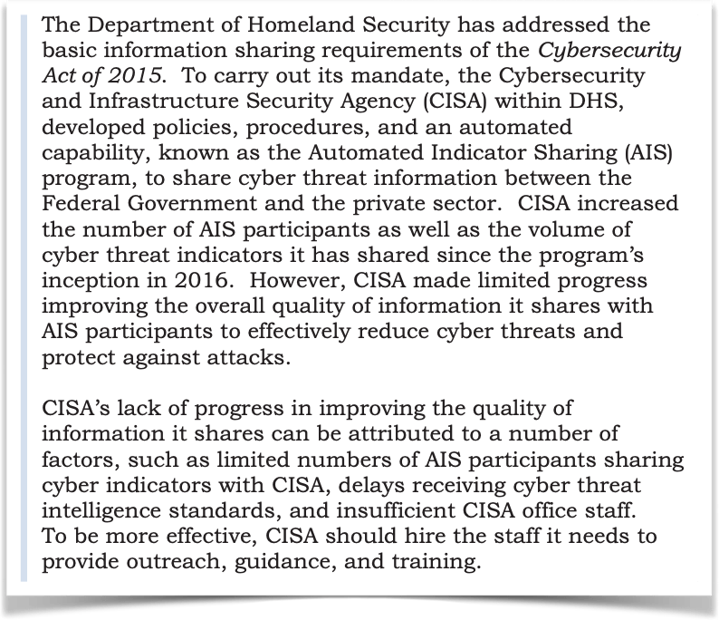 This bill would amend the section of the “Homeland Security Act of 2002” that established the Cybersecurity and Infrastructure Security Agency (CISA) and establish a new Cyber Incident Review Office. And this is even though DHS already has an entity receiving and distributing cyber information. However, there have been long documented problems with this entity inside CISA’s National Cybersecurity and Communications Integration Center (NCCIC). In September 2020, the DHS Office of the Inspector General (OIG) issued one of its periodic evaluations of DHS’ information sharing program and found continued problems: