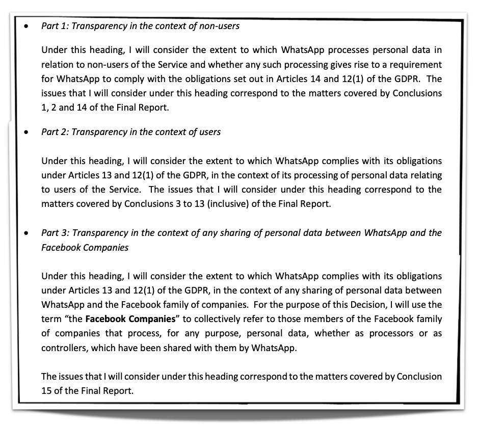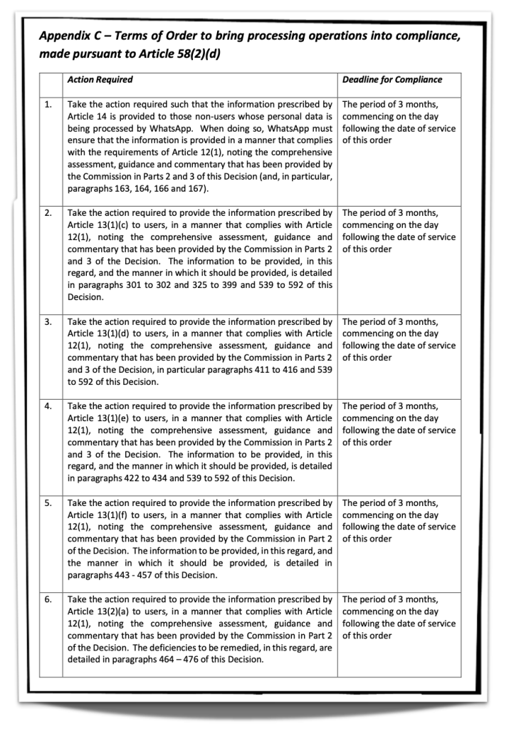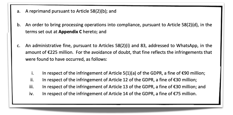 And so, WhatsApp was not telling people the purposes of the processing as well as the legal bases, not disclosing the recipients or categories of recipients of personal data, and not informing people of its intention to transfer personal data out of the EU.