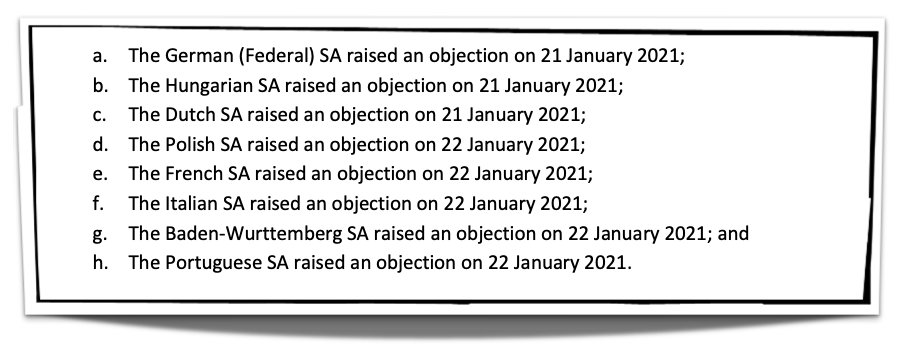 Some of these SAs had already passed along complaints from people in their jurisdictions about WhatsApp data processing practices, it should be noted. The SAs made their objections known, and the DPC could not reach agreement on a number and therefore turned the matter over to the EDPB. The DPC explained: