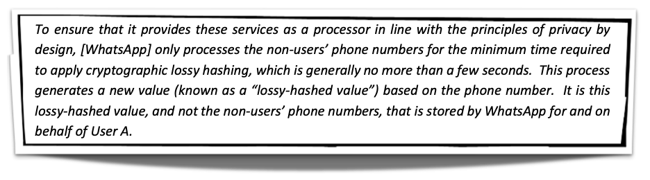 However, the DPC investigators determined WhatsApp was collecting and processing the personal data of non-users through this process. The company argued that it is necessary to briefly access these phone numbers and forcing the company to find another way of figuring out which contacts of a user are on WhatsApp would be prohibitively expensive and technically very difficult.