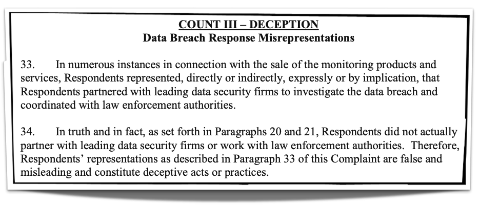 The FTC’s investigation also turned up shoddy data security practices and misrepresentation of these practices, including after a breach, that are brazen. The company claimed it encrypted user data, but it did not. Also, after a breach involving over 2000 customers was discovered, the company falsely claimed to users that it had “partner[ed] with leading data security firms to assist in our investigation” and that they would “coordinate with law enforcement authorities” on the matter.”