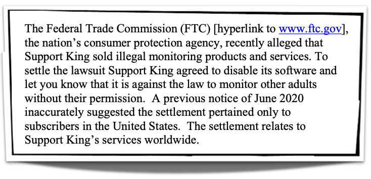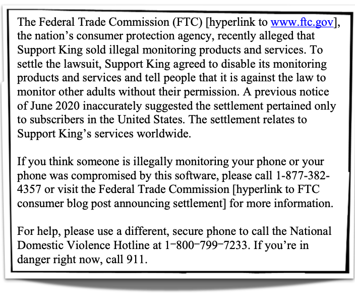 In what may be a first with spyware in the United States (U.S.), the FTC is requiring Support King/SpyFone to push out an “on-screen notification to Mobile Device users with a Monitoring Product or Service installed on their Mobile Device prior to the entry of this Order, which shall Clearly and Conspicuously state:”