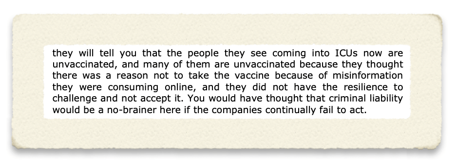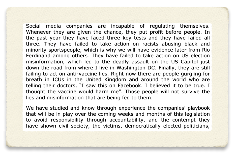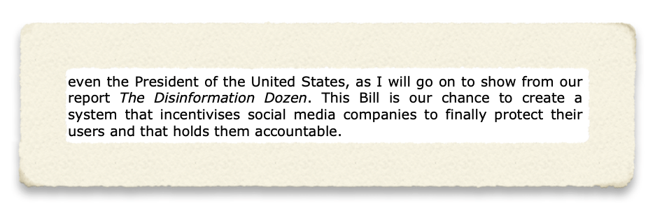 In the unofficial transcript (and Parliament is quite firm that any users of this early transcript stress the fact it is not corrected by MPs, Lords, and witnesses), Center for Countering Digital Hate CEO and Founder Imran Ahmed claimed: