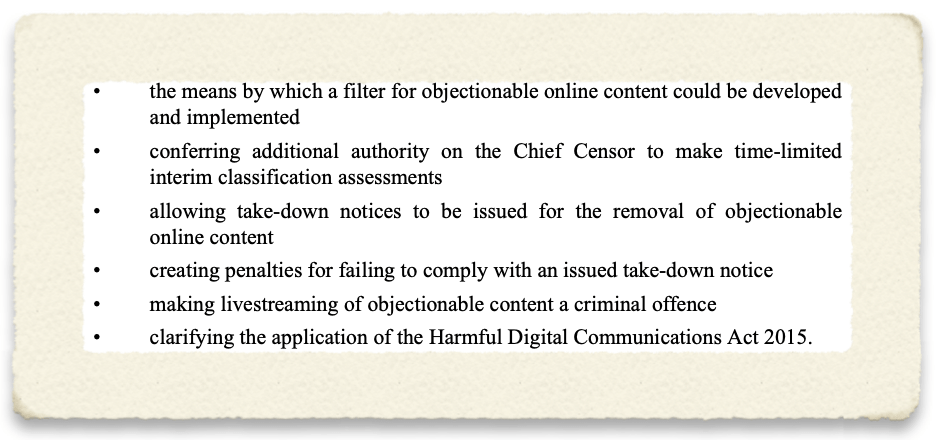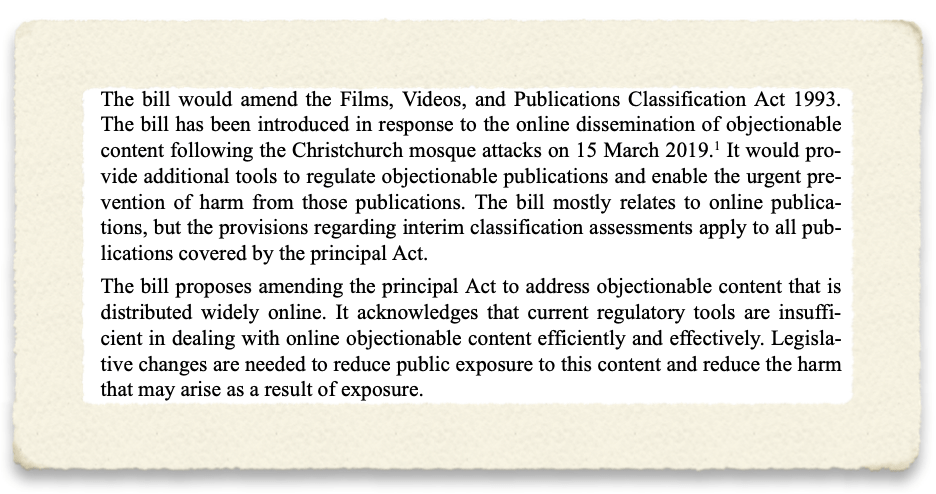 New Zealand is also in the midst of considering an online harms bill, the “Films, Videos, and Publications Classification (Urgent Interim Classification of Publications and Prevention of Online Harm) Amendment Bill.” This bill was driven by the livestreaming of the attack of a Christchurch mosque as explained by the bill’s new sponsor in February 2021: